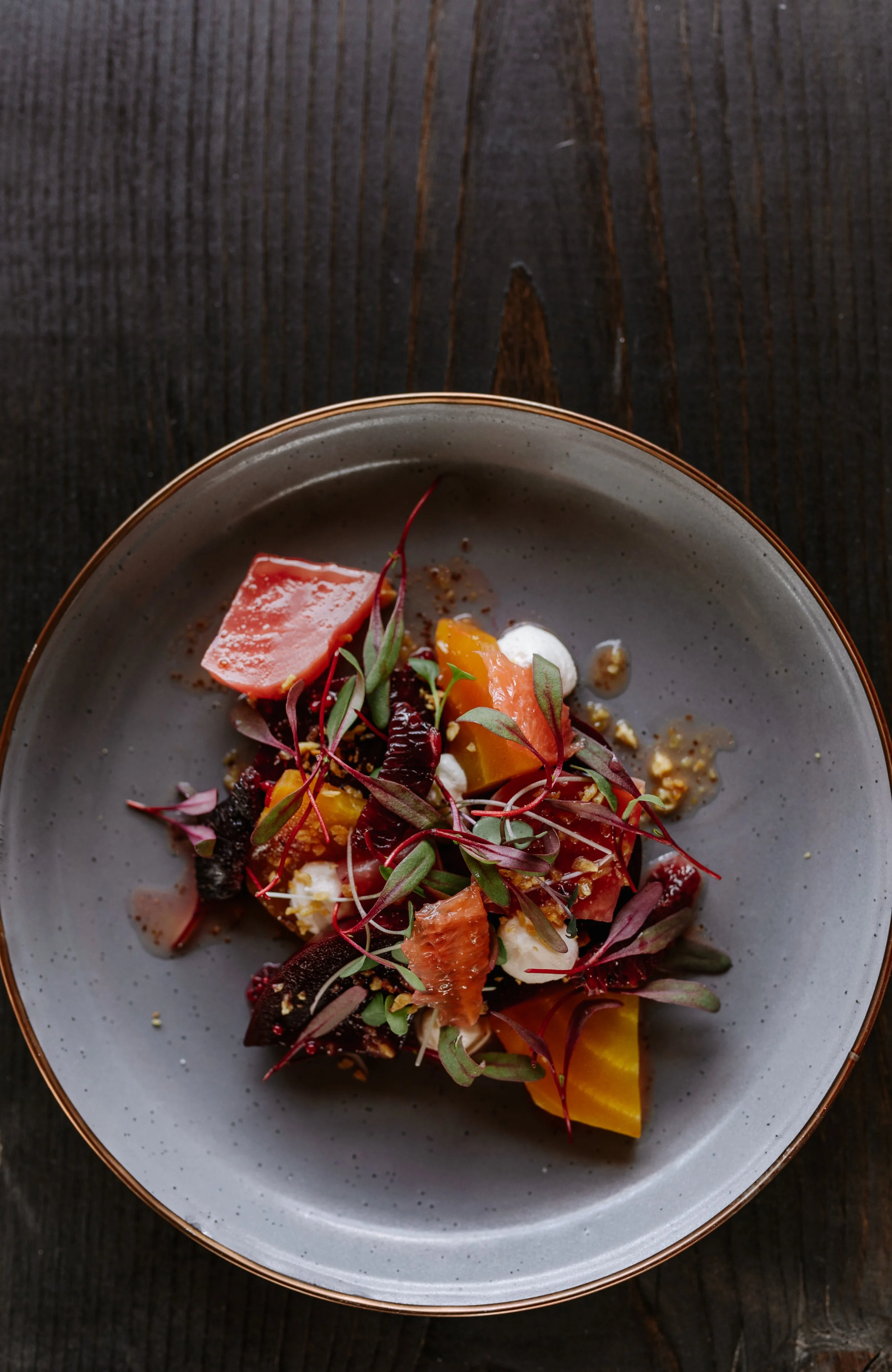 Roasted Beet Salad with Garden Greens: + Maine Blueberry Vinaigrette + Herbed Goat Cheese + Rose/Beet Powder